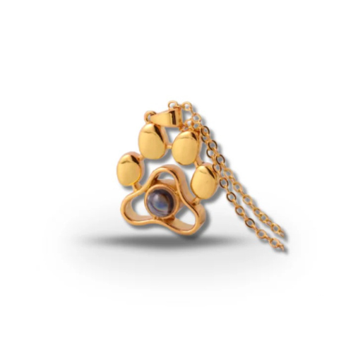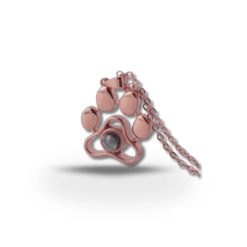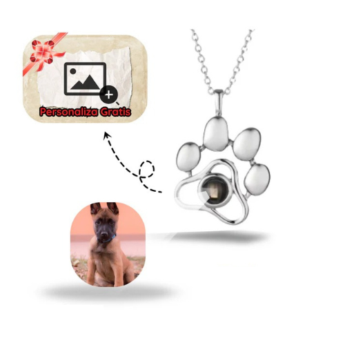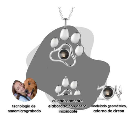 La bolita central del collar proyecta la imagen de tu mascota mediante una microproyección. Puedes verla al mirar a través de ella o iluminándola con una linterna (como la del teléfono) sobre una superficie oscura.